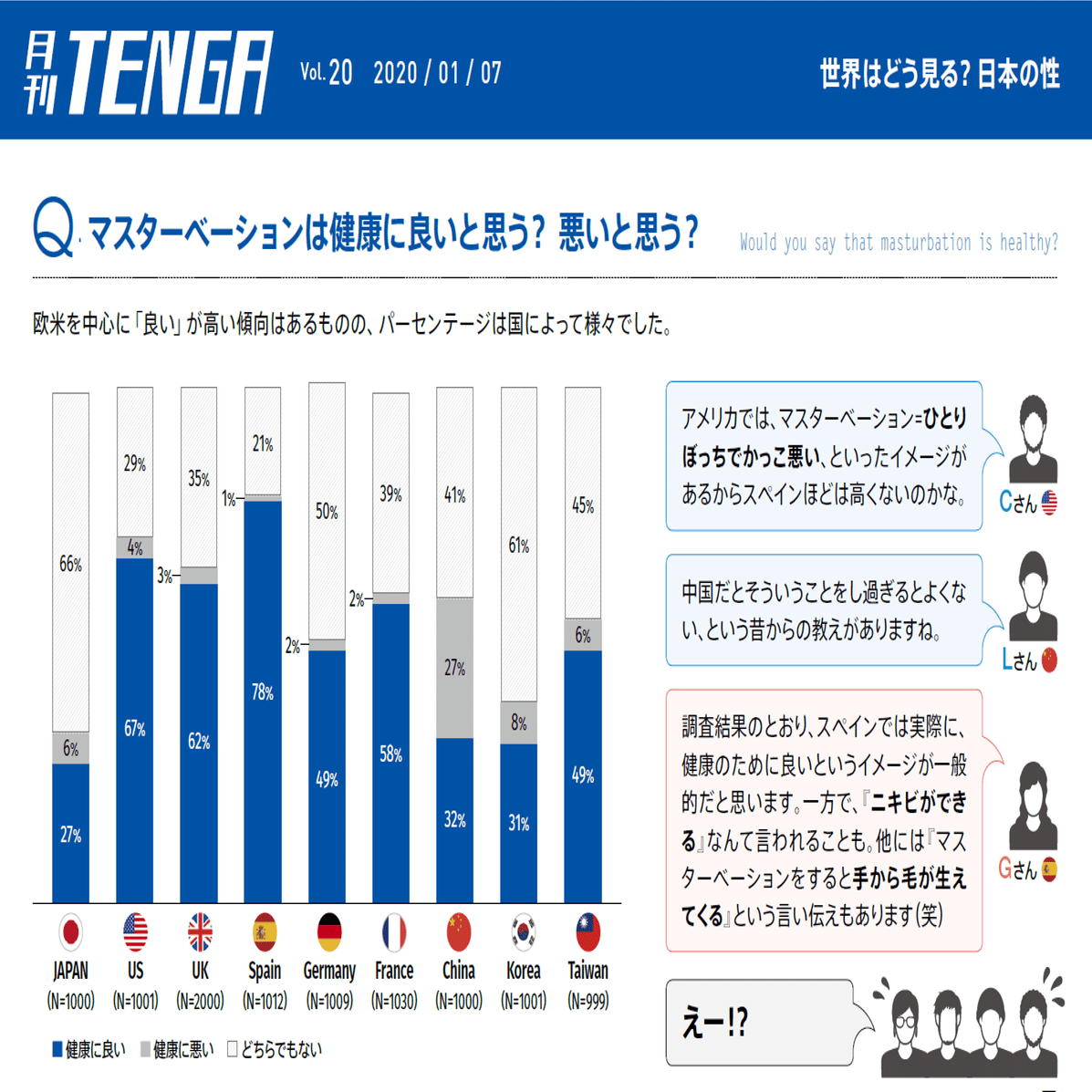 TENGAは「オナニー国勢調査」なるめちゃめちゃ興味深いリサーチもしている。さすが、TENGA。ただ、全国15歳-64歳の男性が対象で、女性のマスタべのことはわからないけど。1週間のマスターベーション平均回数は 2.94回で、トップは神奈川の3.77回、ワーストは徳島県1.95回。この地域差の理由はなんなのだろうか。